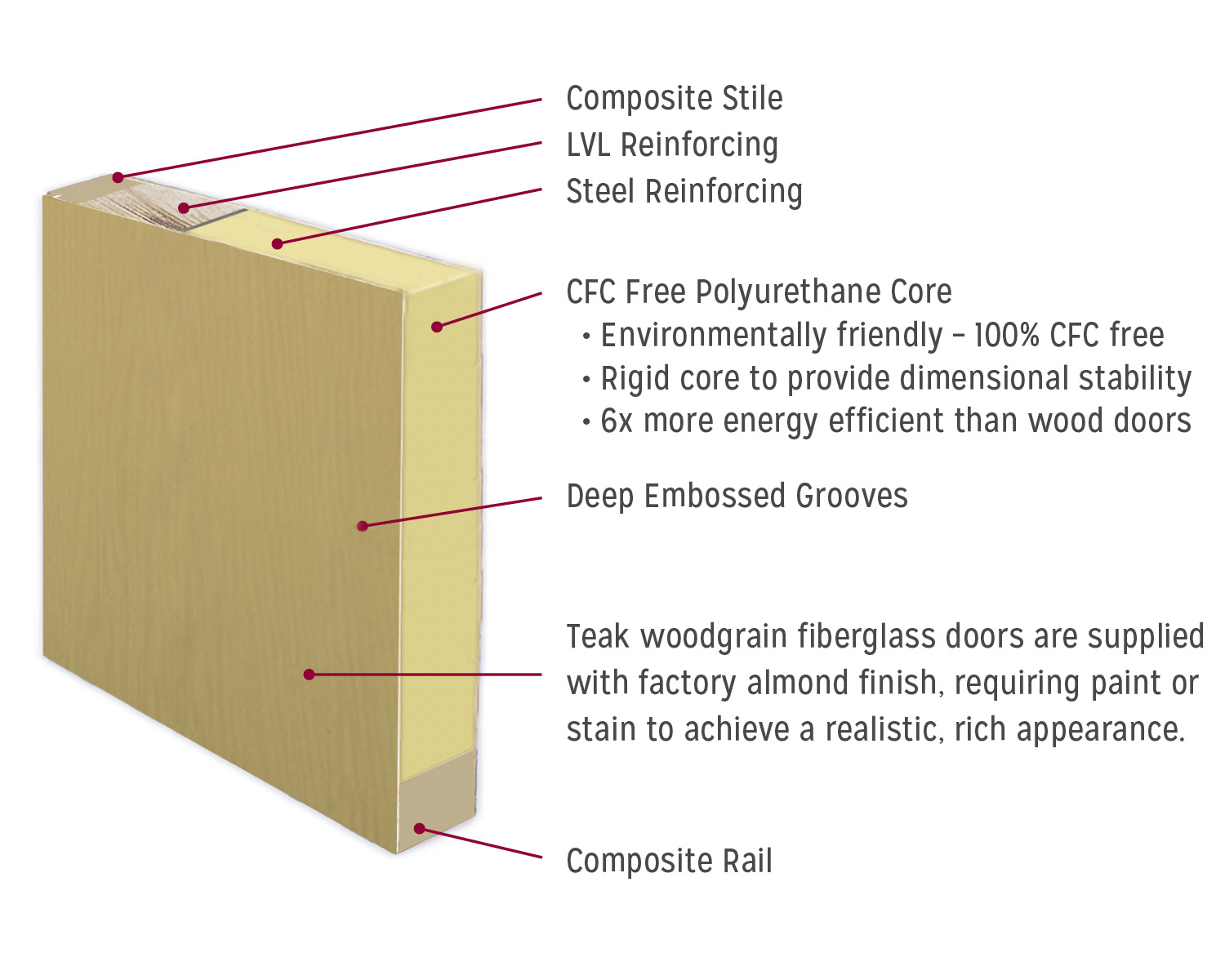 Though the teak series is beautiful with any hardware combination, European styling is achieved when paired with an architectural door pull and deadbolt combination. When ordered, these slabs arrive as a light almond colour to accept paint or gel stain.